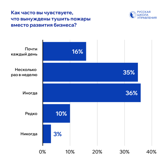 Исследование показало: решение оперативных проблем занимают значительную часть рабочего времени управленцев. 51% руководителей признались, что они постоянно «тушат пожары»: почти каждый день (16%) или несколько раз в неделю (35%).
