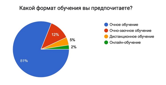 Итоги опроса показали, что по-прежнему большую популярность имеет очная форма обучения (81%). Форматы дистанционного и онлайн-обучения, несмотря на растущий интерес к ним, пока пользуются меньшим доверием: их выбрали лишь 5% и 2% респондентов соответственно.